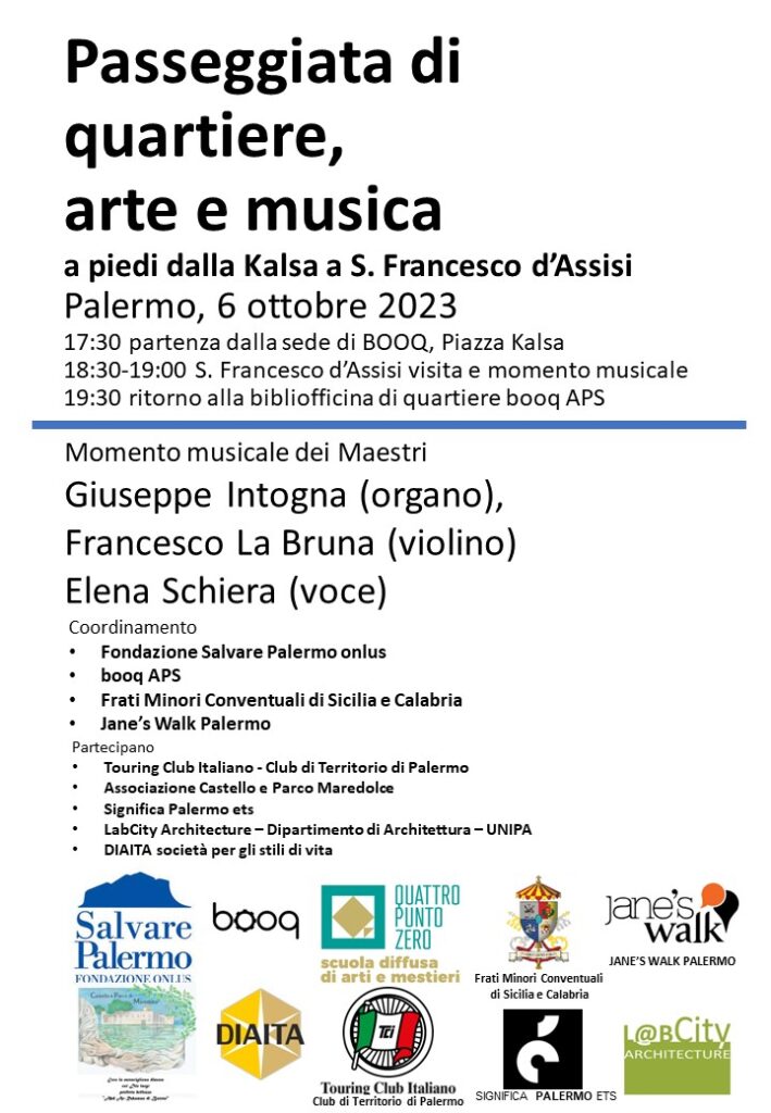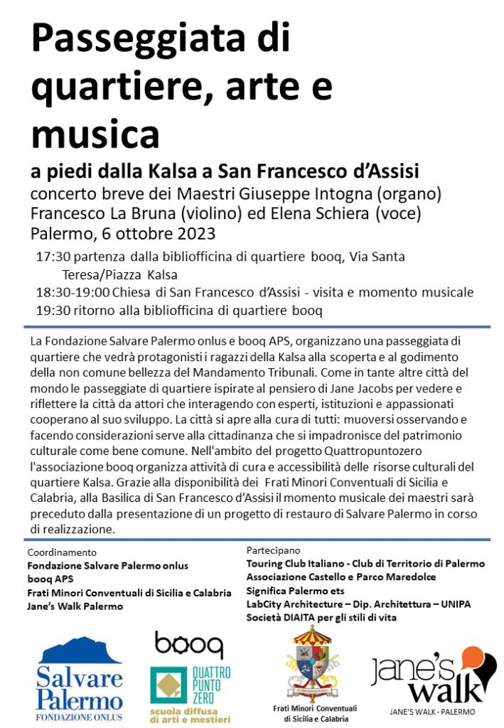 La Fondazione Salvare Palermo onlus e booq APS, organizzano una passeggiata di quartiere che vedrà protagonisti i ragazzi della Kalsa alla scoperta e al godimento della non comune bellezza del Mandamento Tribunali. Come in tante altre città del mondo le passeggiate di quartiere ispirate al pensiero di Jane Jacobs per vedere e riflettere la città da attori che interagendo con esperti, istituzioni e appassionati cooperano al suo sviluppo. La città si apre alla cura di tutti: muoversi osservando e facendo considerazioni serve alla cittadinanza che si impadronisce del patrimonio culturale come bene comune. Nell’ambito del progetto Quattropuntozero l’associazione booq organizza attività di cura e accessibilità delle risorse culturali del quartiere Kalsa. Grazie alla disponibilità dei Frati Minori Conventuali di Sicilia e Calabria, alla Basilica di San Francesco d’Assisi il momento musicale dei maestri sarà preceduto dalla presentazione di un progetto di restauro di Salvare Palermo in corso di realizzazione.